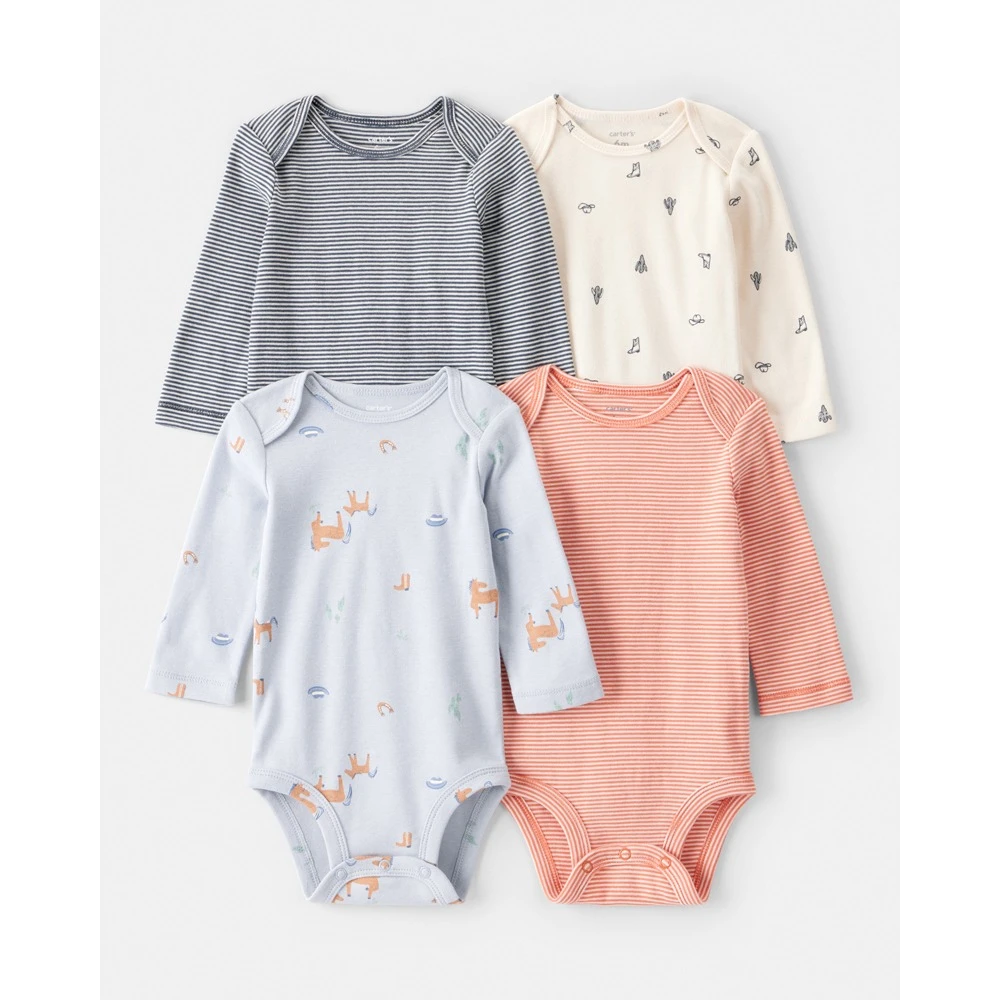El Carter's Pack 4 Bodies Mangas Largas ofrece comodidad y practicidad. Confeccionados en 100% algodón, estos bodies cuentan con mangas largas y hombros superpuestos para facilitar el cambio. Los broches super resistentes soportan múltiples lavados en lavarropas.